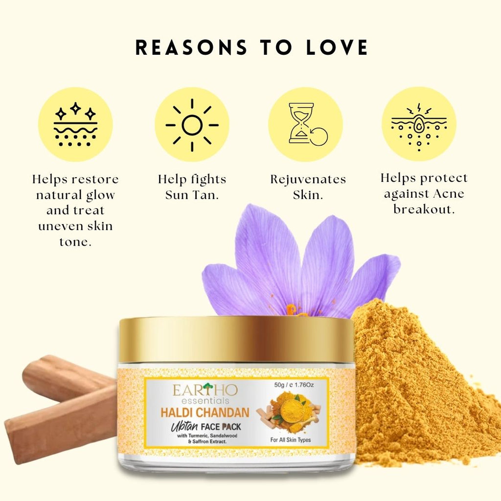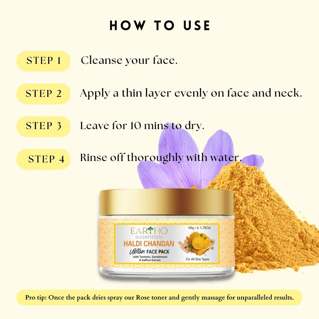 Haldi Chandan face pack contains Turmeric extracts, Sandalwood, Aloevera, and Multani mitti. It removes tan, dead skin cells and enhances natural glow.
